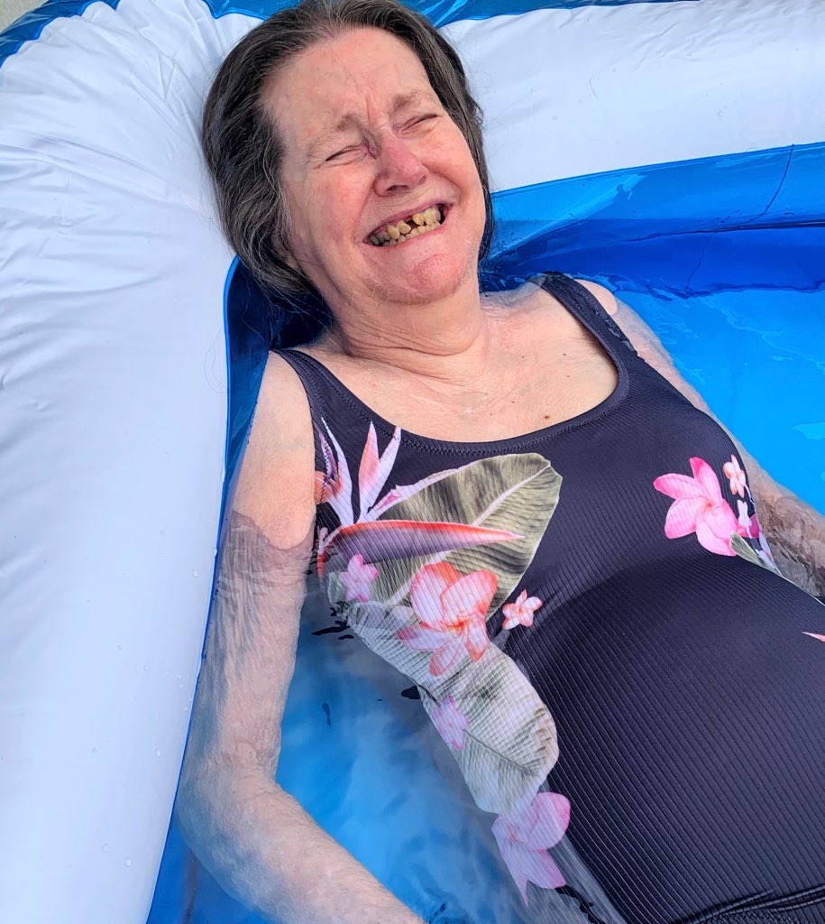 At The Denver Hospice, we strive to help our patients experience as much joy as possible despite the challenges of illness they face. So it was extremely rewarding for the dedicated members of our North team to share in the recent fun and laughter with a patient who isn't ready to give up swimming. Barbara Lloyd, 81, is mother of five who has lived in Northern Colorado for almost 50 years. Her eldest son, Timothy Lloyd, explained that before she moved into the Life Care Center of Longmont to receive extra support for advancing illness, she used to swim frequently at a pool just a block away from her home." Although Barbara is no longer able to manage a swim on her own in deep water, it was still possible to enjoy a refreshing dip on a sunny day ' by bringing a small pool to her nursing home. The Denver Hospice provided the pool when Barbara told them about her desire to swim again. Members of our North team, who have been caring for Barbara since January and assisted in the swim experience, shared these pictures of her bright smile. Barbara's children are grateful to know that her hospice care team is not only helping her manage pain and other symptoms of serious illness, but also helping her find ways to make the most of every day. 'The hard thing is not knowing when or how her illness will progress,' said Peter about the cancer that has required increasingly advanced care for his mother. 'I'm glad to see she was having some fun.' Barbara Lloyd, The Denver Hospice patient, enjoys a swim in a blowup pool
