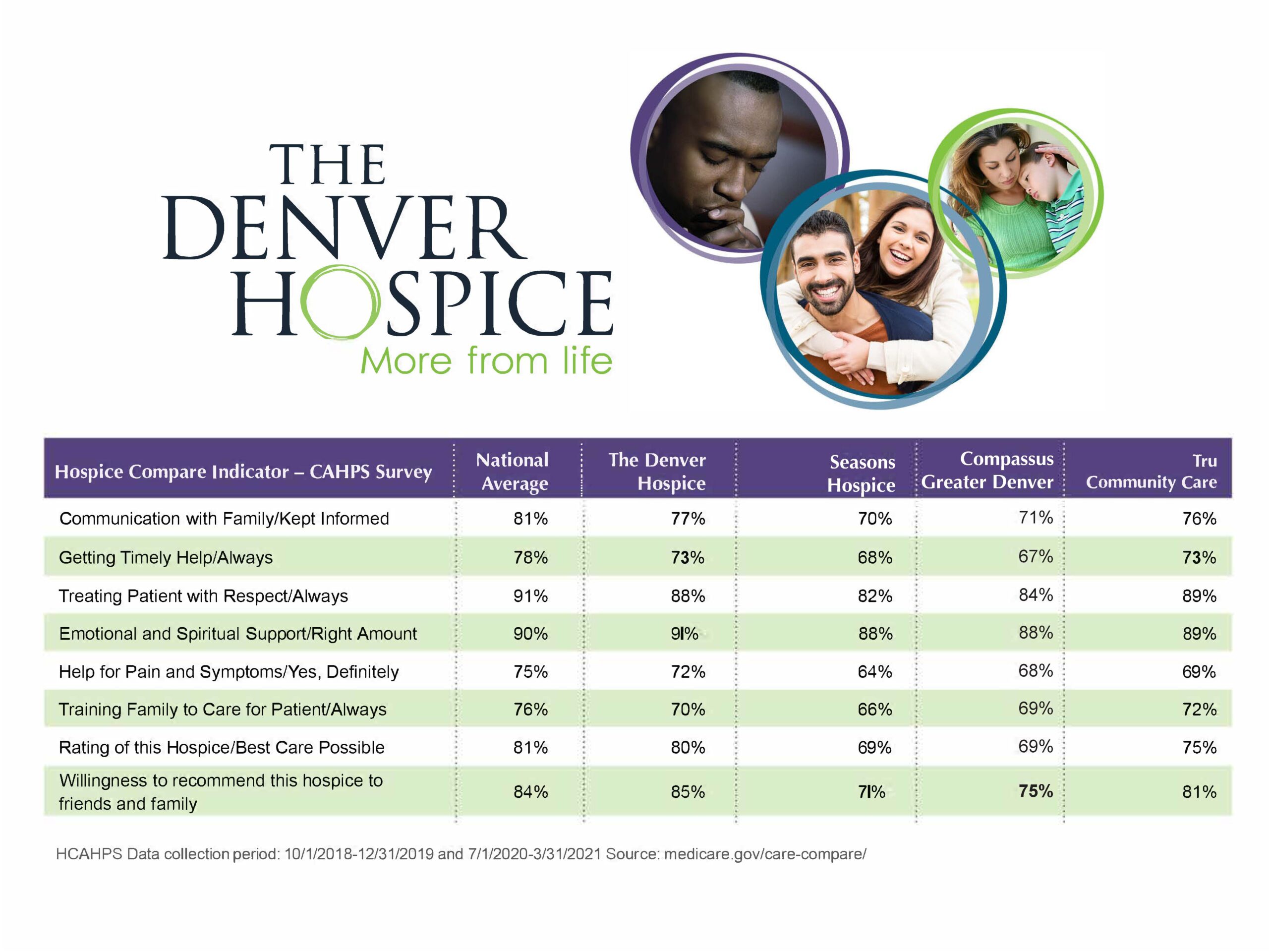 In the most recently reported CAHPS scores, The Denver Hospice presents as a top performer in the metro Denver area on all eight areas measured by CMS for the reporting period of July 1, 2020 through March 31, 2021.